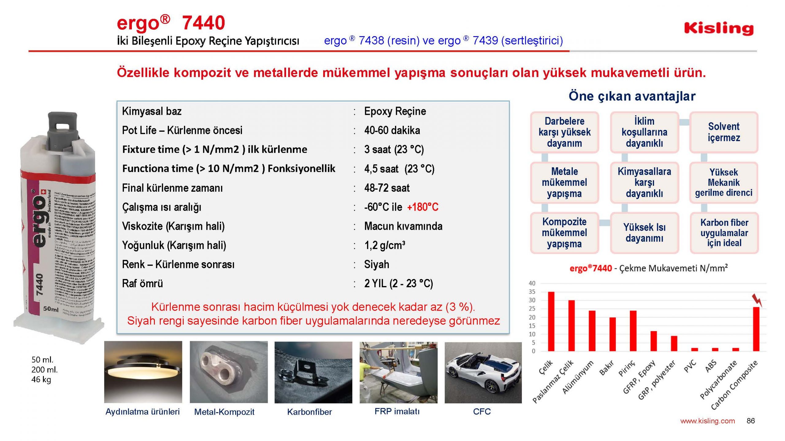 ergo 7440 siyah, yüksek etkili bir epoksi yapıştırıcı. Özellikle karbon-fiber, kompozit ve metalleri yapıştırmak için idealdir. İlk kürlenme zamanı sona erdikten sonra ürün hızlı bir dayanım gösterir. Bu sayede küçük montaj ve işleme için yeterli dayanım sağlamış olur.